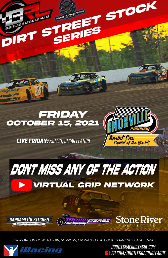 After a very tight, action packed race, Brandyn Proudfoot won the second race of the season in the Bootleg Racing League’s Dirt Street Stock Series for the Jim Beaver eSports team ahead of William Hargreaves and Kenny Kibbey giving him a 30 point lead over Billy Northcutt in the point standings.